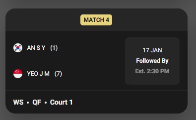| 여자 단식 | 안세영 | 여지아민 (싱가포르) | 오후 6시 00분 |