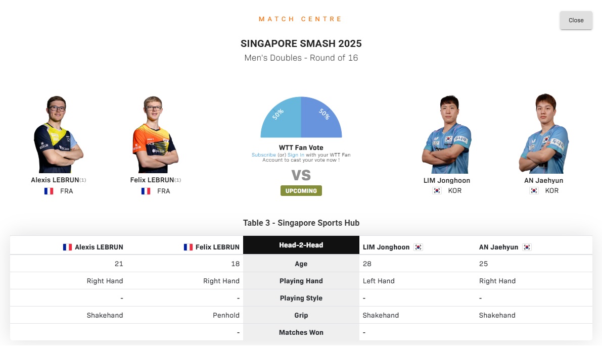 🇰🇷 임종훈·안재현 vs 알렉시스 르브룅·펠릭스 르브룅 (프랑스) 🇫🇷