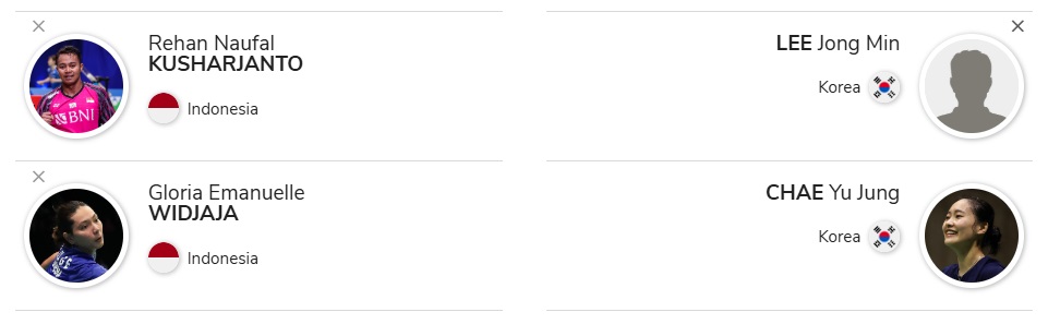 | 혼합 복식 | 이정민, 채유정 | 쿠샤르잔토, 위자자 (인도네시아) | 19:00 |