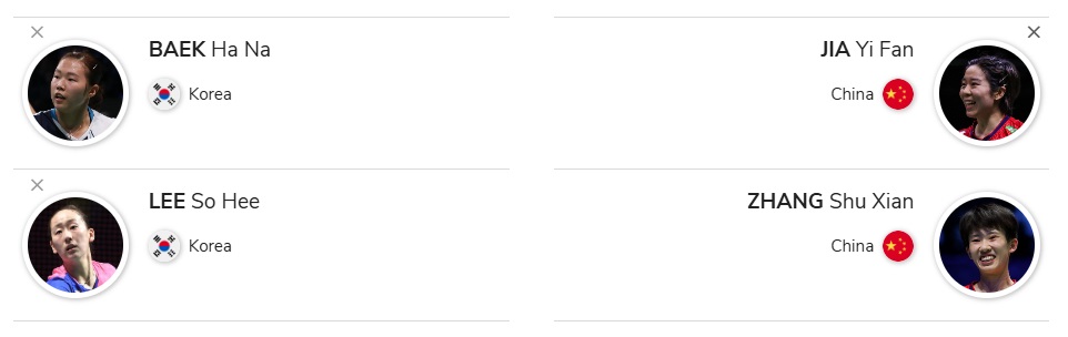 | 백하나·이소희 | 지아이판·장수셴 (중국) | 14:10 | 23:10 |