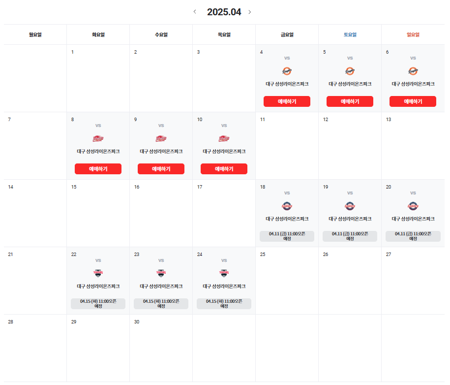 홈경기 일정 (대구삼성라이온즈파크)
