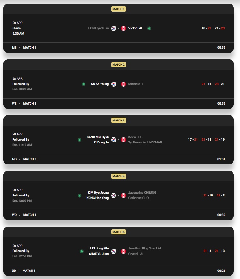 4월 28일 열린 조별리그 2차전에서 한국 대표팀은 캐나다를 상대로 4대 1 승리를 거두었습니다.