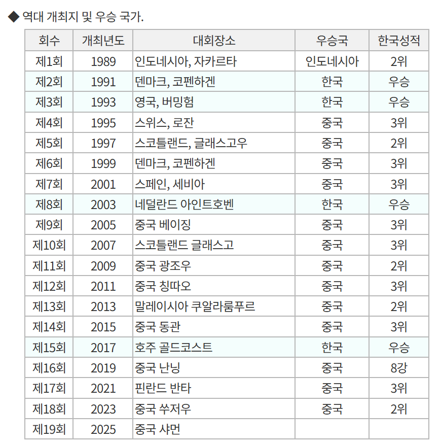 한국의 수디르만컵 성적 요약
