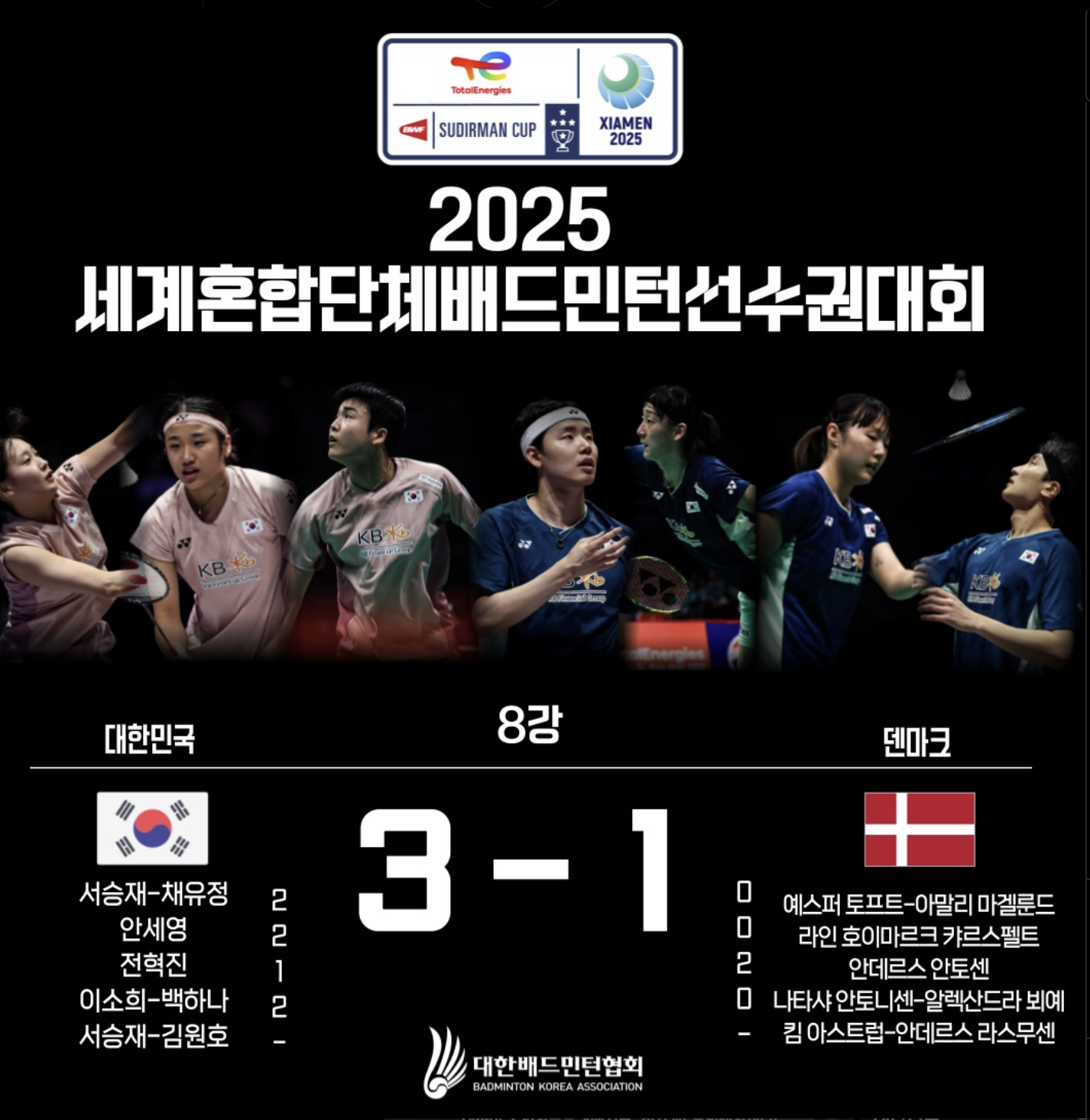 | 혼합복식 | 승 (2-0) | 서승재-채유정 vs 토프트-마겔룬드 |