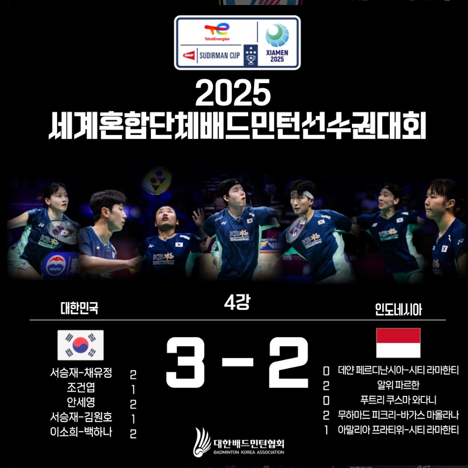 대한민국 결승 진출! 2025 수디르만컵, 한국 대표팀의 집념이 통했다