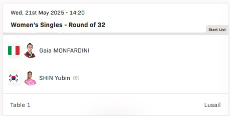 | 오후 8:20 | 여자 단식 | 신유빈 | 몬파르디니 (이탈리아) | 32강 |