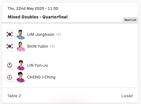 | 17:00 | 혼합복식 | 임종훈·신유빈 | 린윤주·정이칭 (대만) | 8강 |