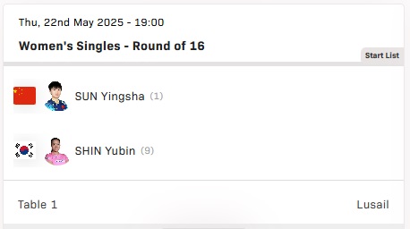 | 01:00 (23일) | 여자 단식 | 신유빈 | 쑨잉사 (중국, 세계랭킹 1위) | 16강 |