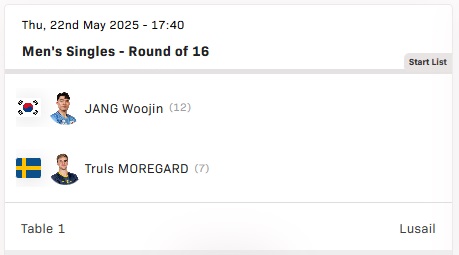| 23:40 | 남자 단식 | 장우진 | 트룰스 모레가르드 (스웨덴) | 16강 |