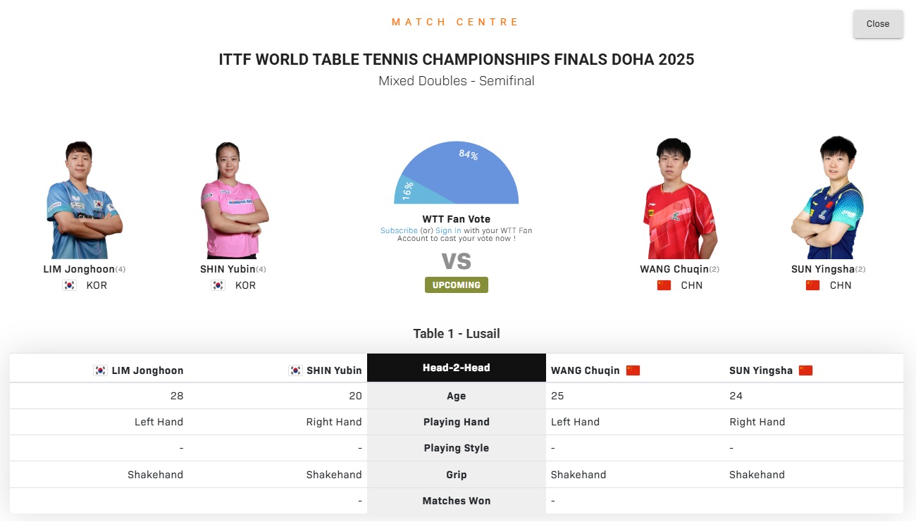 | 매치업 | 임종훈-신유빈 vs 왕추친-쑨잉사 |